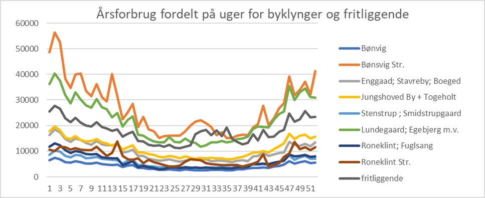 Forbrugsprofilerne for de 9 grupper af netstationer er relativt ens, om end det også fremgår, at grupperingen Bønsvig Strand og Roneklint Strand har et øget forbrug om sommeren samt nogle forbrugsspidser omkring nogle ferier og weekender, som viser, at der her er mange sommerhuse, men også en hel del helårsboliger. De fritliggende netstationer har også et sommerforbrug, som både kan skyldes udlejning til feriegæster og evt. ekstra forbrug ved høsttid.