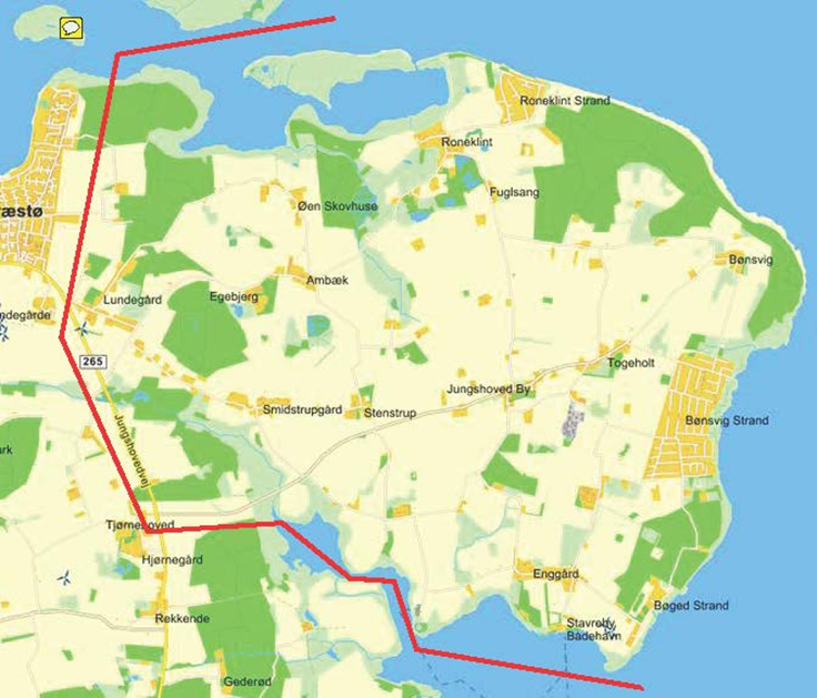 Også her fremgår er de fire med tyrkis indrammede områder, hvor det skraverede felt indenfor angiver områder, hvor der er mere end 400 meter til nærmeste bebyggelse. Det nordøstligste område vil nok grundet de nært beliggende sommerhusområder Bønsvig Mark og Bønsvig Strand mindre egnet.