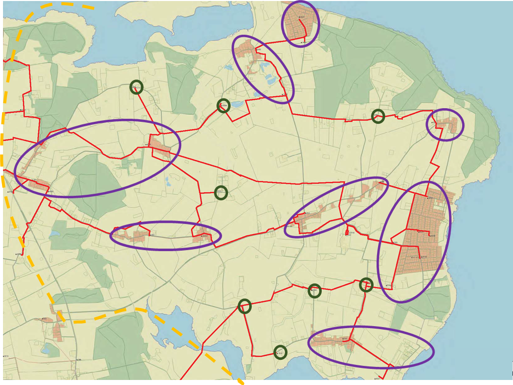 Der er foretaget en summering af områdets elforbrug i 2024 på basis af det forbrug, der har passeret alle de netstationer (10->0,4 kV transformere), der forsyner området. Der er med lilla ringe markeret de by-klynger og med grønne ringe de fritliggende netstationer, der danner grundlaget for optællingen af elforbruget.