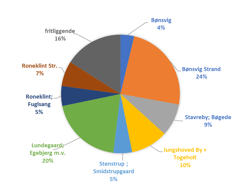 Det største forbrug på 24 % ligger i Bønsvig Strand, som udgør et sammenhængende sommerhusområde. Herefter kommer landsbyerne Lundegård, Egebjerg, Ambæk og Skovhuse, som samlet udgør 20 %, fulgt af de fritliggende landbrug og boliger, som begrundet i erhvervsaktivitet udgør 16 % af det samlede netto-elforbrug selvom antallet af bygninger her er relativt lille.