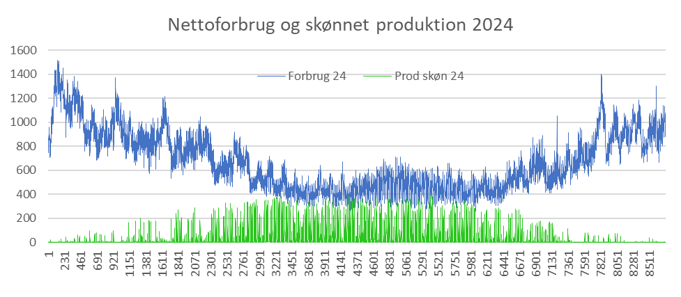 Den følgende figur viser fordelingen af netto-elforbrug og -produktionen fra solceller.