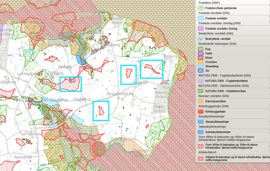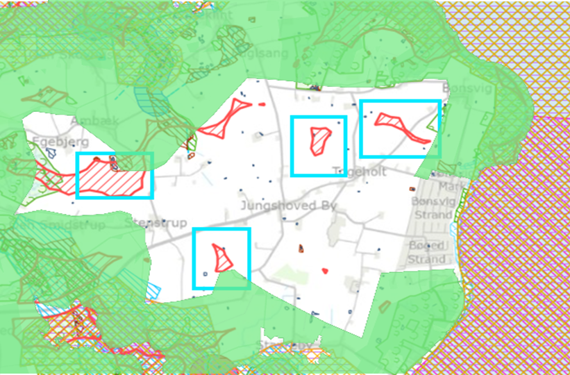 Af kortet fremgår også de mulige placeringer af vindmøller, som er marker med røde skraverede områder, som er bestemt af det afstandskrav, der er fra vindmøller til de nærmest beliggende ejendomme. Af disse områder er det de fire, der er markeret med en tyrkis firkant, der er de relevante at vurdere nærmere, da de ikke overlapper med andre naturhensyn. Ud over de af kommunen udstukne naturhensyn, har Naturstyrelsen også udpeget området af særlig landskabelig værdi, som i det følgende kort er medtaget som en grøn skravering oven på et udsnit af kortet ovenfor.